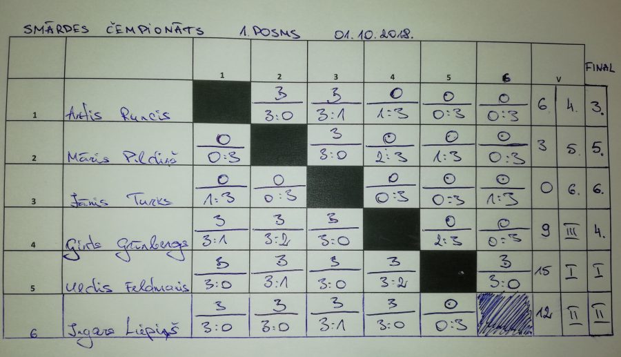 Lai arī mazskaitlisks, tomēr azartisks pirmais posms Smārdes galda tenisa čempionātā šajā sezonā ir aizvadīts! Pirmā vieta Uldim Feldmanim, otrā Ingaram Liepiņam, bet trešā – Artim Runcim.