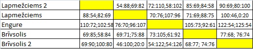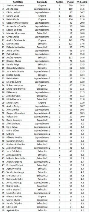 Brīvsolis 2 – Starts 14, Krūmiņš 13, Prihodko 11, Rasnačs 6, Reinfelds 5, Važa 3, Sprigulis 2, Pildiņš 0, Skabs 0 punkti.