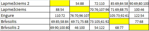 Engure – Atelbauers 39, Feldmanis 23, Ozols 14, Litke 11, Silavs 5, Račuks 0 punkti.
