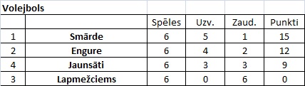 Ar pēdējo sabraukumu Smārdē 12.februāra vakarā, noslēdzies Engures novada volejbola čempionāta regulārais turnīrs un ir noskaidroti pusfinālu pāri.