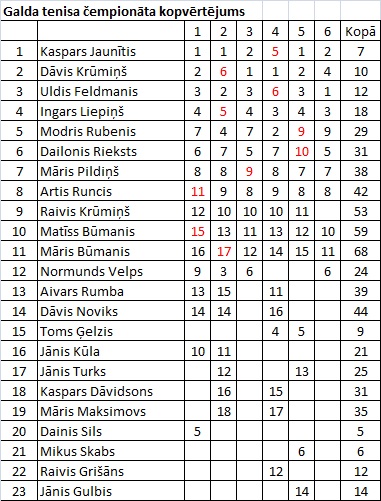 Lapmežciemā aizvadīts pēdējais posms Engures novada galda tenisa čempionātā, kurā piedalījās 11 dalībnieki. Pārspējot savu tuvāko sekotāju Dāvi Krūmiņu pusfinālā, par šīs sezonas čempionu kļuva Lapmežciema pārstāvis – Kaspars Jaunītis. Trešais kopvērtējumā – Uldis Feldmanis.