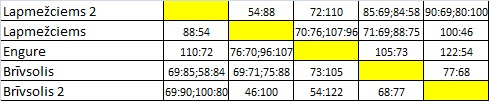 Lapmežciems 2 – Niedra 32, Kalnrācenis 17, Sūna 10, Millers 9, Kaļva 6, Gūtmanis 4, Blūms 3, Seļickis 3 punkti.