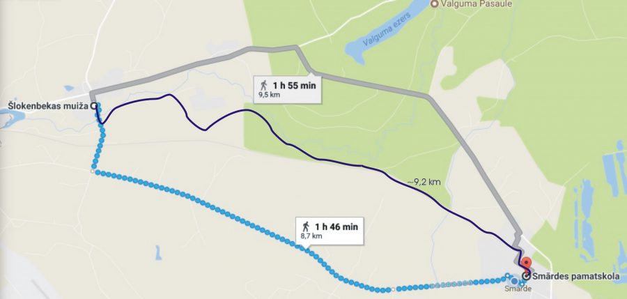 Tā kā google map nepiedāvā trešo variantu – caur mežu, tad esam to kartē iezīmējuši, bet reāli dabā jāatrod pašiem. Tas gan ir ļoti jauks meža ceļš no Milzkalnes līdz 56 km. Tālāk ir divas iespējas – skriet ārā uz ceļu Milzkalne – Smārde, vai arī turpināt pa kartē iezīmēto taisnāko ceļu gar dzelzceļa līniju (ir taciņa).