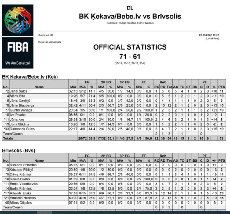 BK Ķekava/Bebe.lv – Brīvsolis 71:61