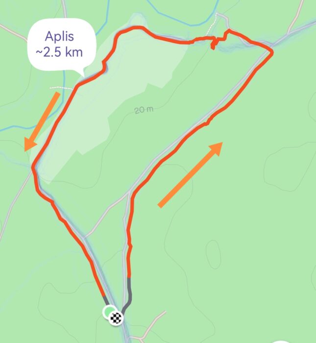 Marķētais aplis ir 2.5 km garš – gan pa meža ceļu, gan pa pļavas ceļu!