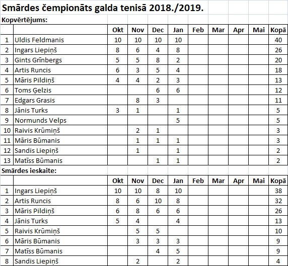 Aizvadīts janvāra posms Smārdes galda tenisa čempionātā, kurā šajā posmā startēja 11 dalībnieki. Šoreiz pirmais Uldis Feldmanis, otrais bija Ingars Liepiņš, bet trešais Toms Ģelzis.