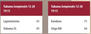 Basketbola čempionātā divas spēles aizvadītas, kurās uzvaras izcīnīja Kandavas un Tukuma sporta skolas komandas.