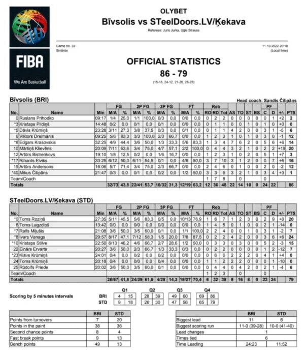 Brīvsolis – Klievēns 20, Elviks 16, Krasovskis 14, Andersons 12, Dreimanis 12, Krūmiņš 6, Bistrenkovs 3, Prihodko 2, Čilipāns 1, Pildiņš.