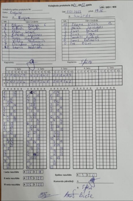 Volejbola čempionātā uzvara Engurei 11.01.2022. Pēc īsa pārtraukuma, kas bija pēc pirmā apļa, atsācies Tukuma novada atklātais volejbola čempionāts, kurā tika aizvadīta spēle Engurē – Engure pret Smārdi. Engure – Smārde 3:0 (25:18, 25:22, 25:22)